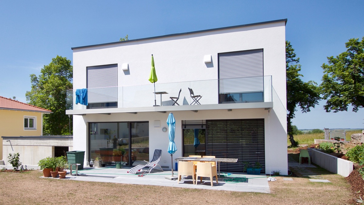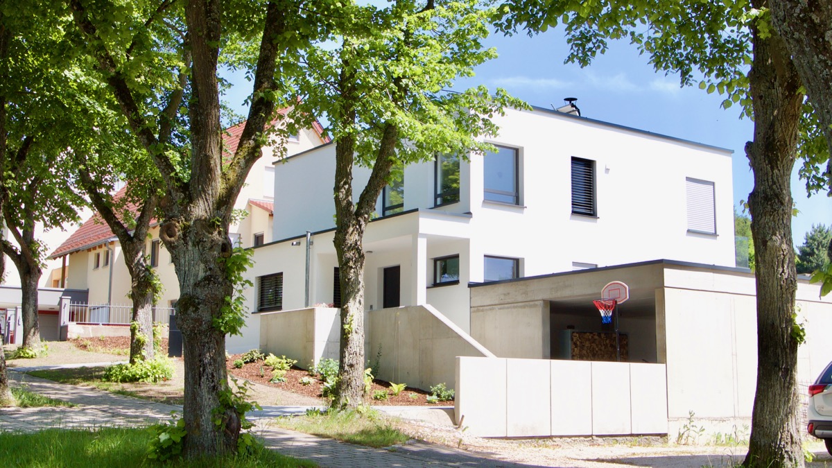 Ein Weiße Kubus, modern, schlicht und energetisch optimiert, so lässt sich das Einfamilienhaus von Familie R. aus Weißenburg treffsicher beschreiben. Auf zwei oberirdischen Etagen bieten die knapp 160 qm Wohnfläche ausreichend Platz für die vierköpfige Familie.