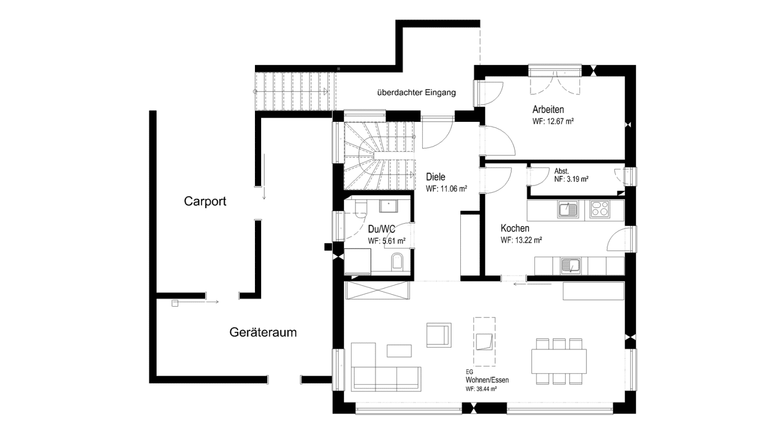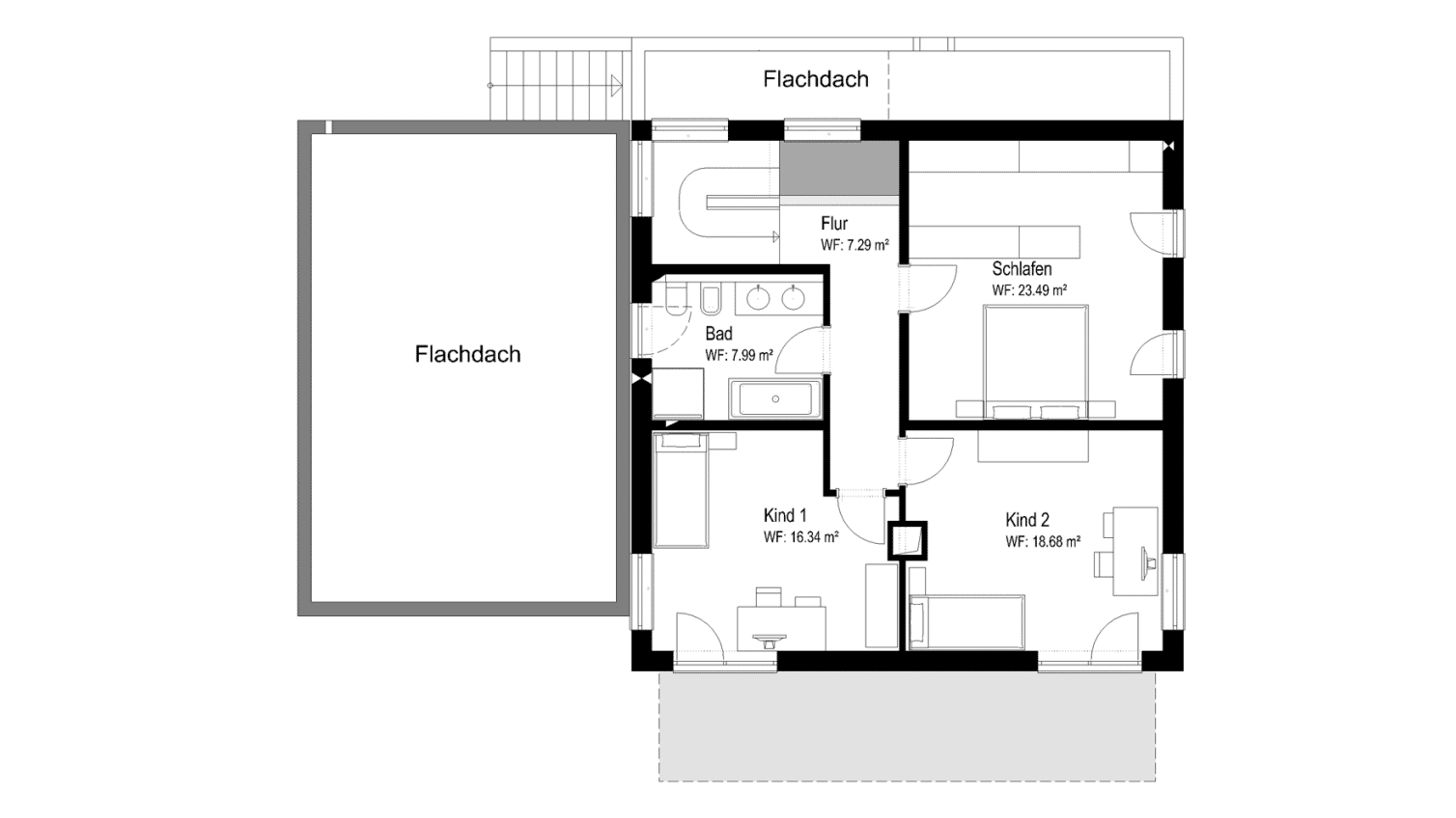 Im Obergeschoss bietet der große Balkon mit filigranem Glasgeländer den Kindern eine tollen Freiluftspielplatz. Der Grundriss gestaltet sich kompakt und klar strukturiert. Hochwertige Materialien unterstreichen die schlichte Eleganz des Hauses.