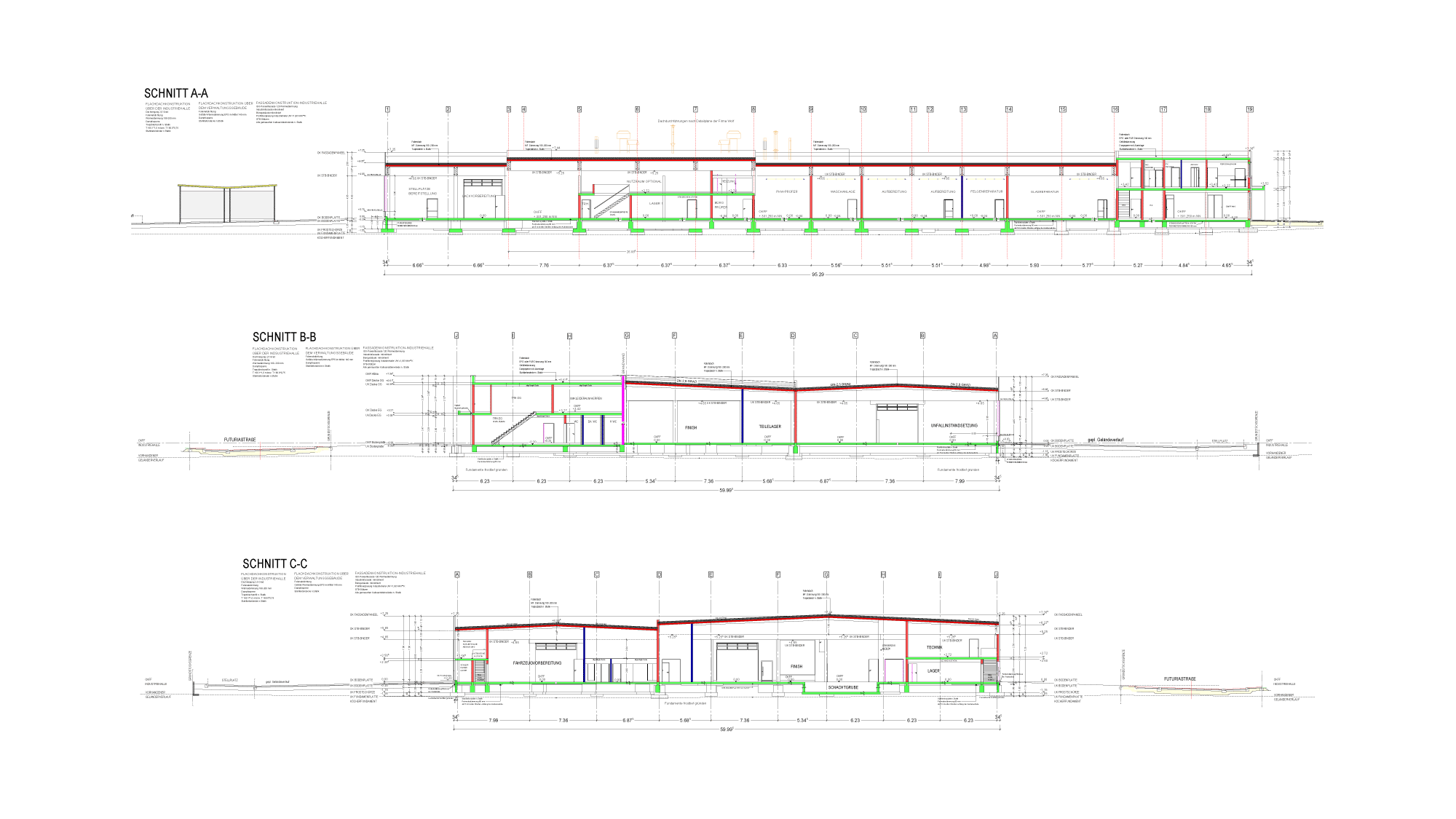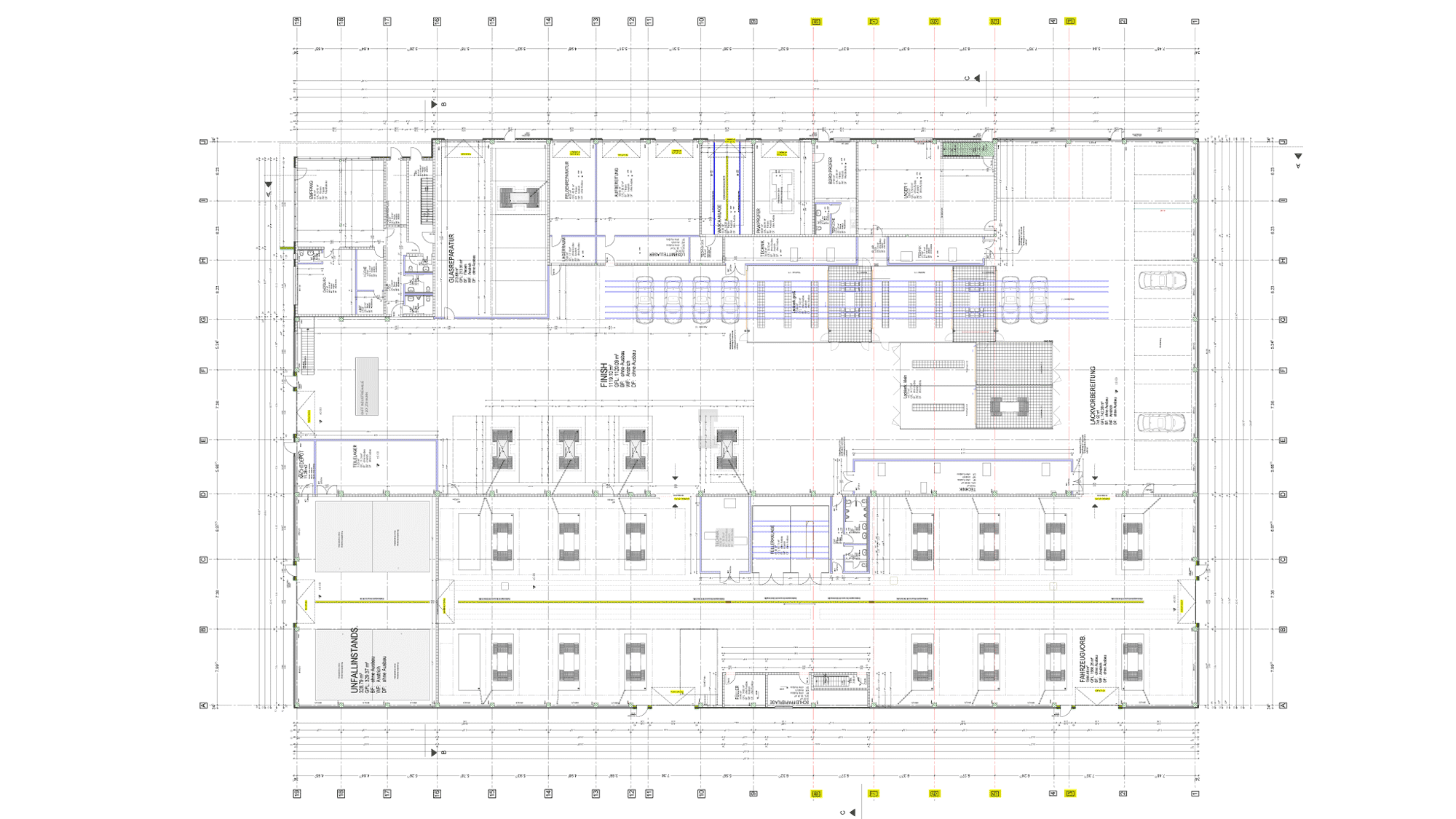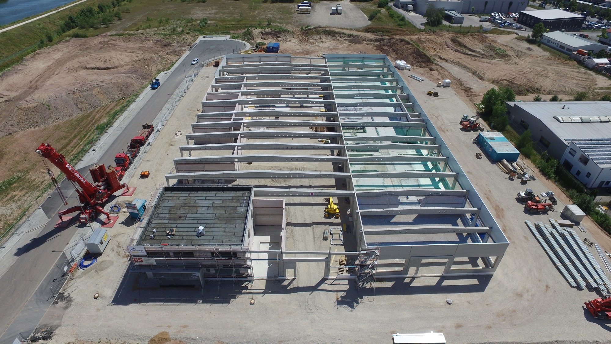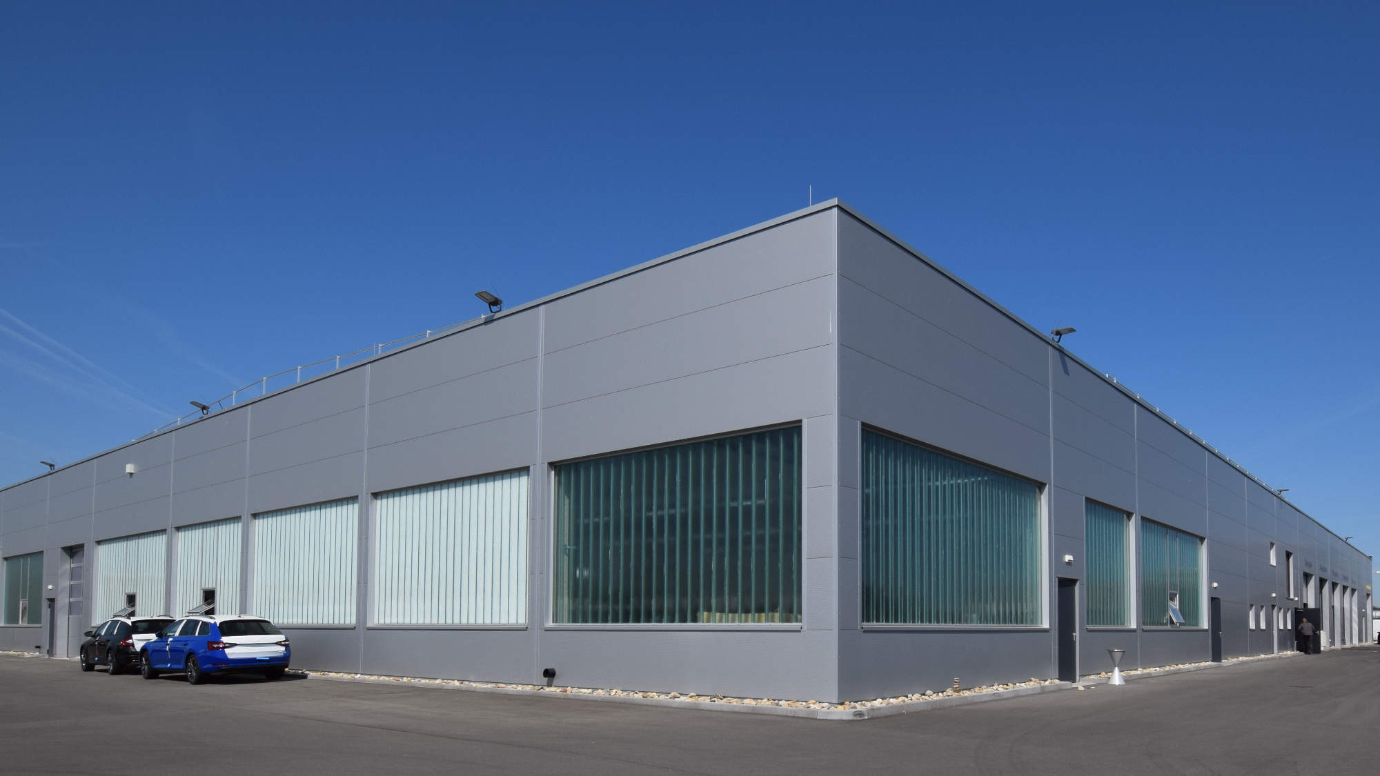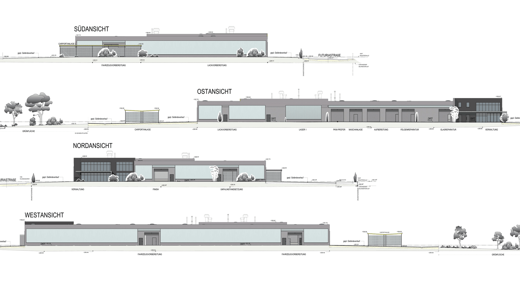 Der Neubau der Industriehalle beinhaltet mehrere Einheiten mit verschiedenen Nutzungen, u.a. Lackiererei, Unfallinstandsetzung, Waschanlage, Schadensaufnahme und Bürotrakt.