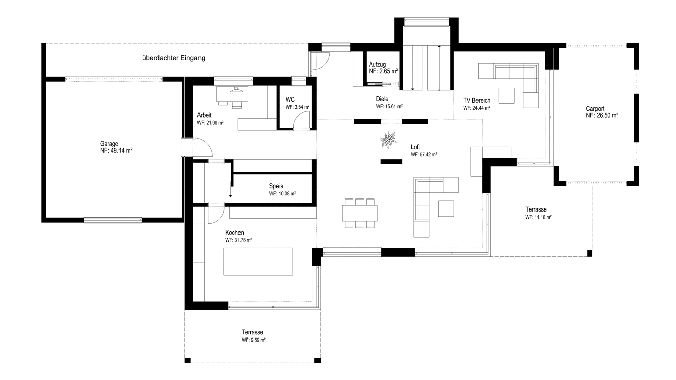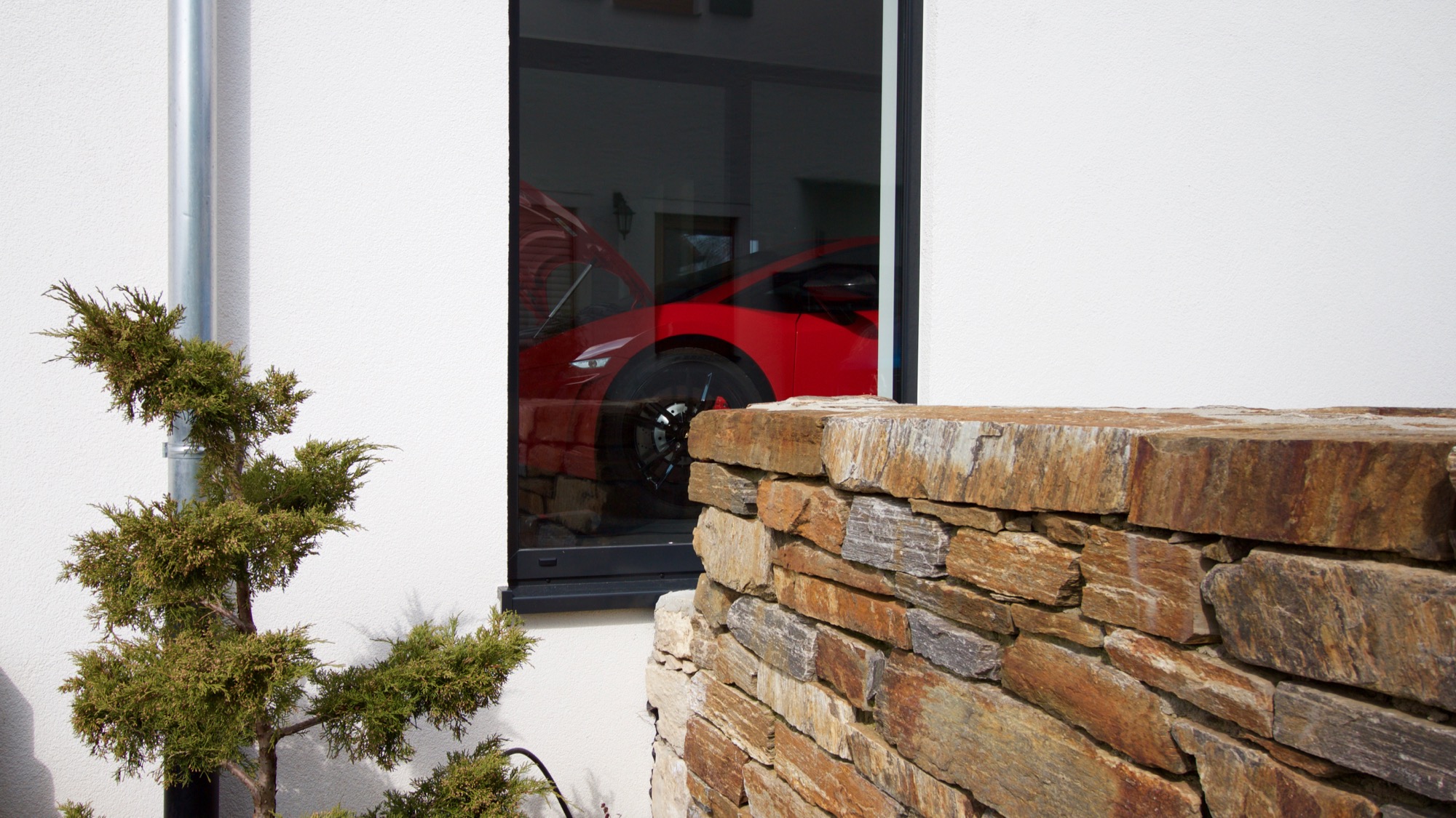 Das kubische Gebäude mit Flachdach intergiert sich optimal in die starke Hanglage und nutzt geschickt die Verbindung von Wohnraum und gestaffelten Terrassen. Das loftähnliche Erdgschoss integregriert neben Koch- und Arbeitsbereich auch eine Doppelgarage und ein vom Wohnzimmer sichtbares Carport. Als Autofreund hat der Bauherr so stets sein "Liebling" vom Wohnbereich im Blick.